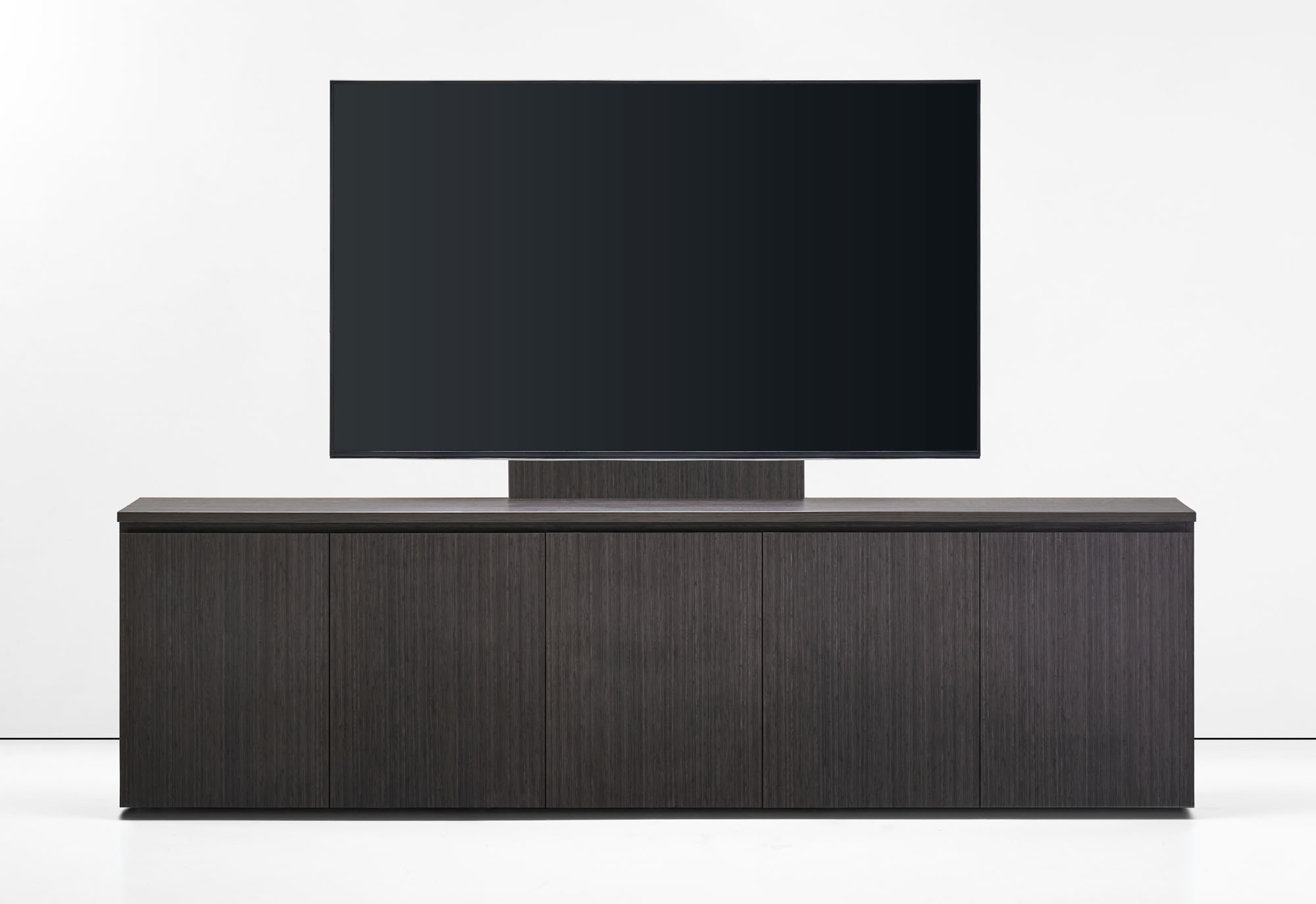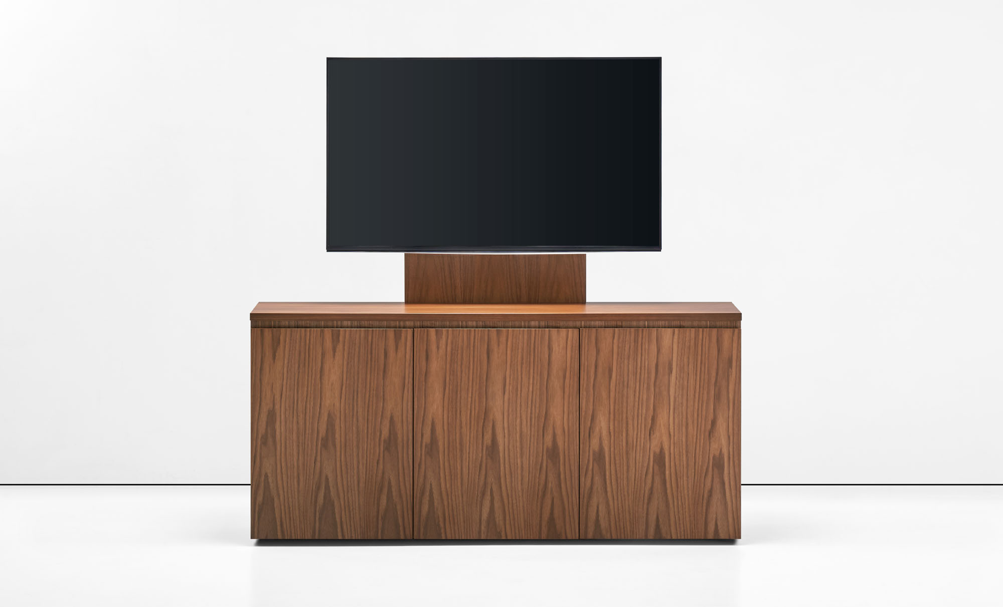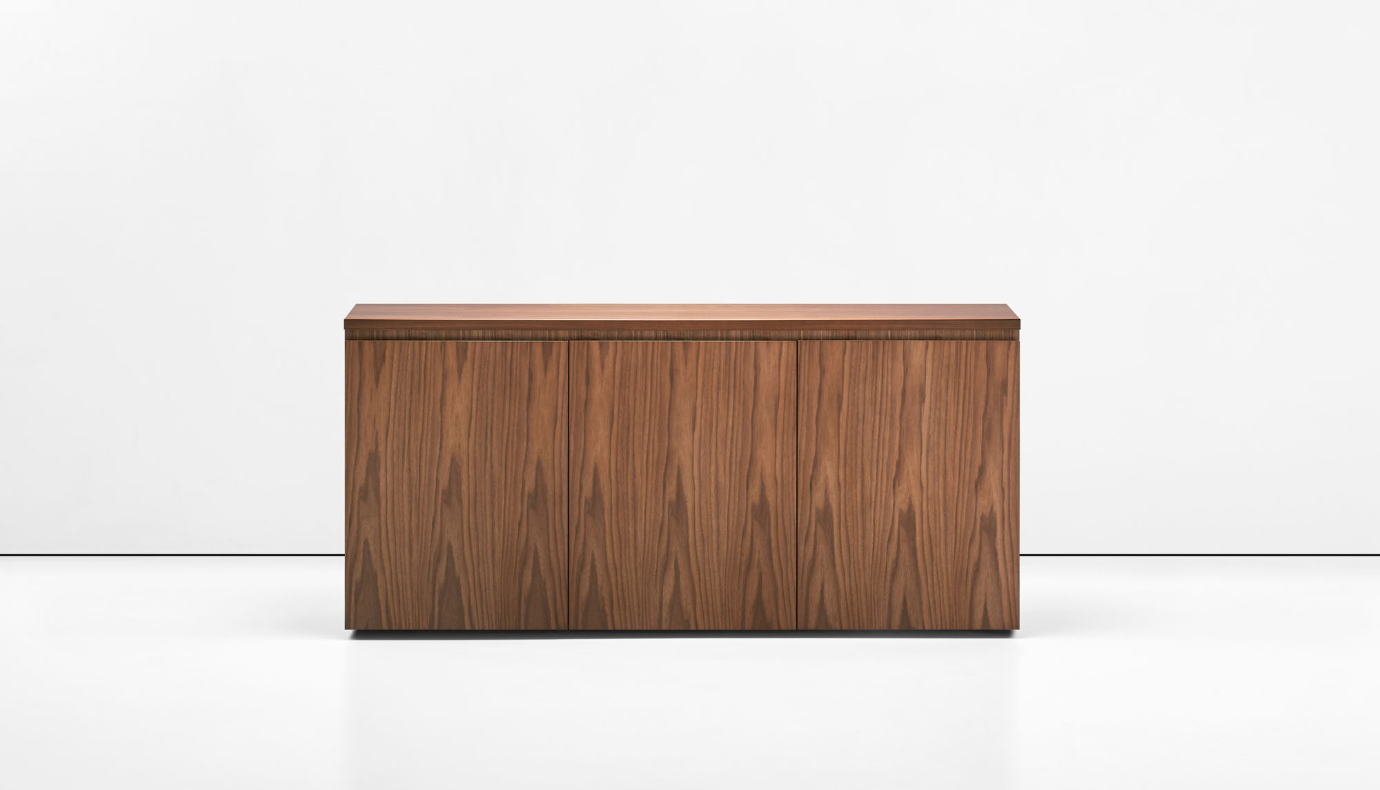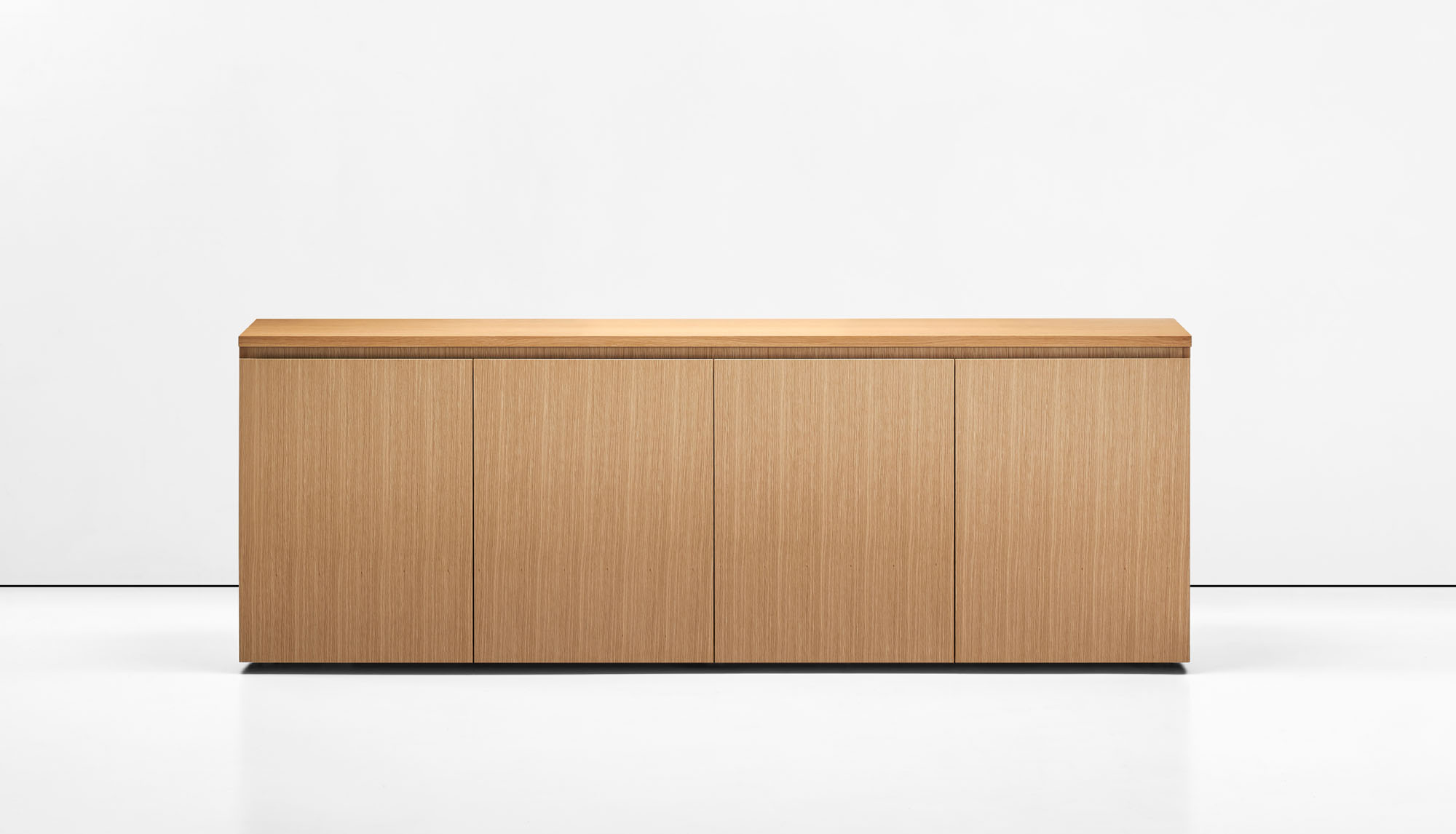 Available in three widths, Profile credenzas are featured in oak and walnut. Profile credenzas can be specified as standalone units or with pillars, allowing monitors to be mounted at any height.