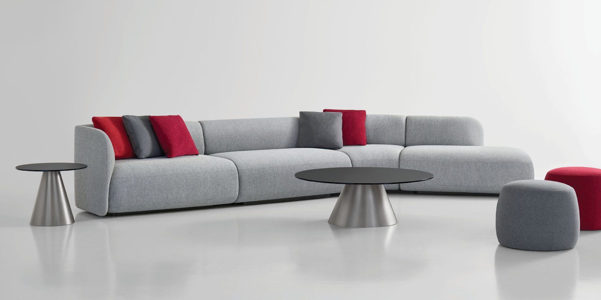 Sunset offers a wide range of seating options, including a freestanding lounge, modular and freestanding two-seat modules, and connecting corners. Back and backless versions provide more options to accommodate varied spaces. All versions are supported by a black plinth base.